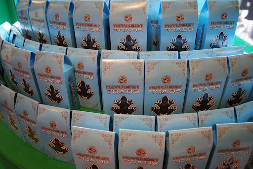 Honeydukes is definitely one of the most dazzling candy shops I’ve ever been in! The bright green and pink paint are perfectly suited to the glass jars of candy and delectable goodies they have for sale. There are shelves upon shelves of Chocolate Frogs. Boxes and boxes of Bertie Bott’s Every Flavor Beans. Sugar quills, Ton-Tongue Toffee, Pepper Imps, Peppermint Toads… They had so many different types of candy straight out of the books. The Cauldron Cakes were especially cool looking (but I didn’t get a picture of them). They were chocolate cauldrons that looked like they had green icing/foam bubbling out of the top.
